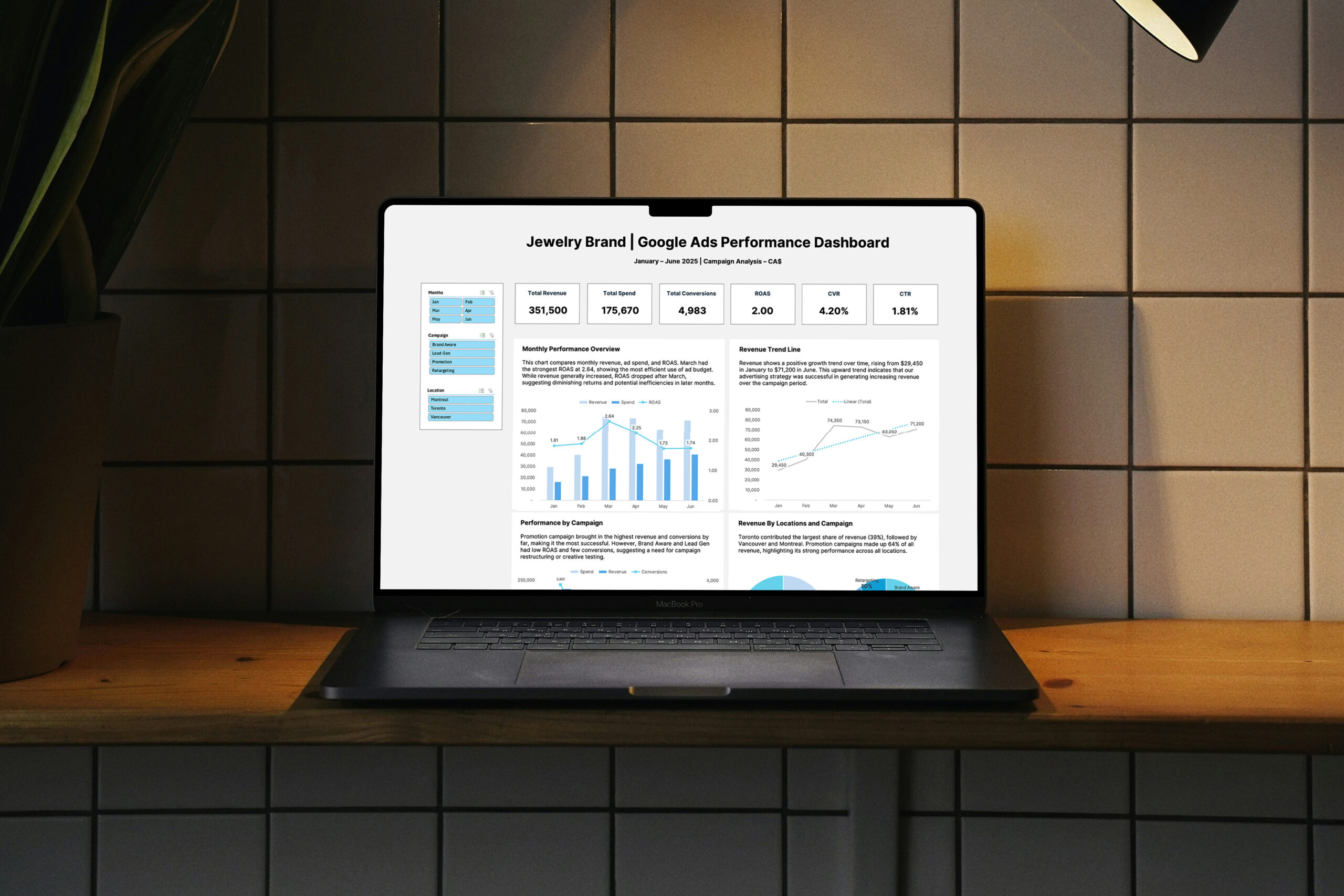 Built an interactive Excel dashboard analyzing six months of Google Ads data for a Canadian e-commerce jewelry brand. The dashboard transforms raw data into actionable insights, enabling campaign optimization and budget efficiency improvements to maximize ROAS.